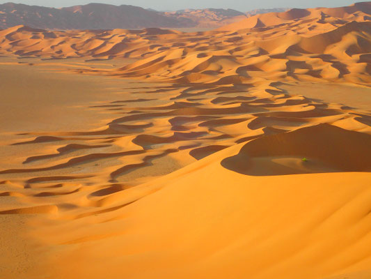 Balade dans le plus grand désert de sable au monde: le Rub al Khali ou quart vide. Oeuvre du vent, les arabesques se succèdent et s'entremêlent, plaisir des yeux dans ce lieu d'intense silence.