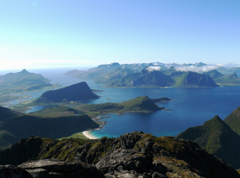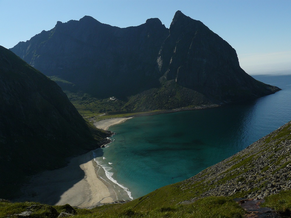 Montée au Ryten (543 m) dominant de 500 m de falaises la mer de Norvège et la fameuse et magnifique plage de la baleine, Kvalvika, accessible uniquement à pied par la montagne, et par la mer. Descente à la plage et retour par un petit col